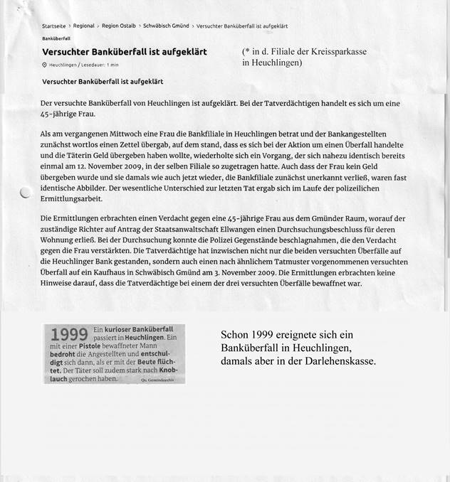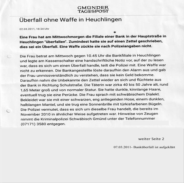 Banküberfall in Heuchlingen. Wann? -- Am 2.3.2011 Wo? -- In der Filiale der Kreissparkasse an der Hauptstraße in Heuchlingen.
