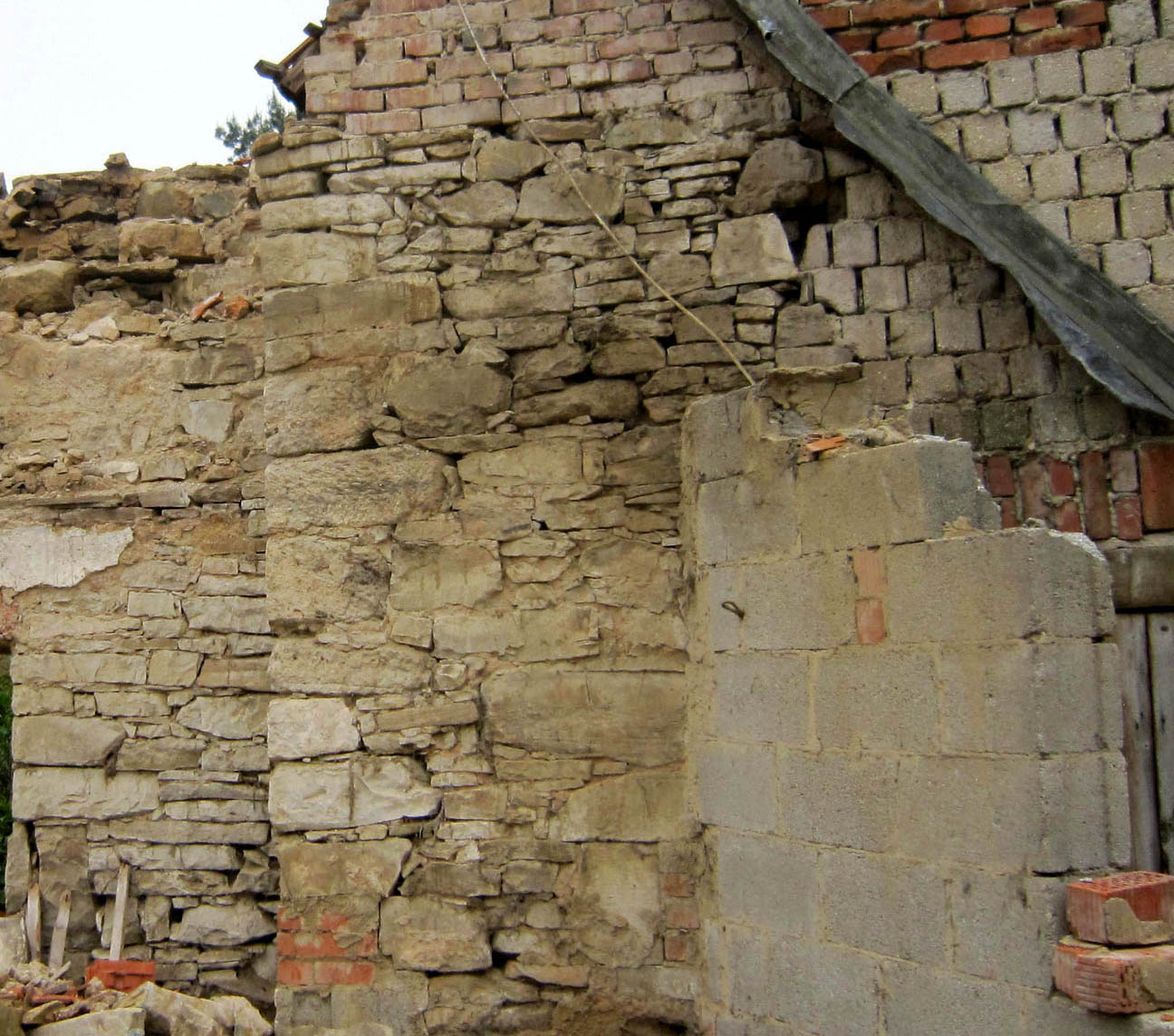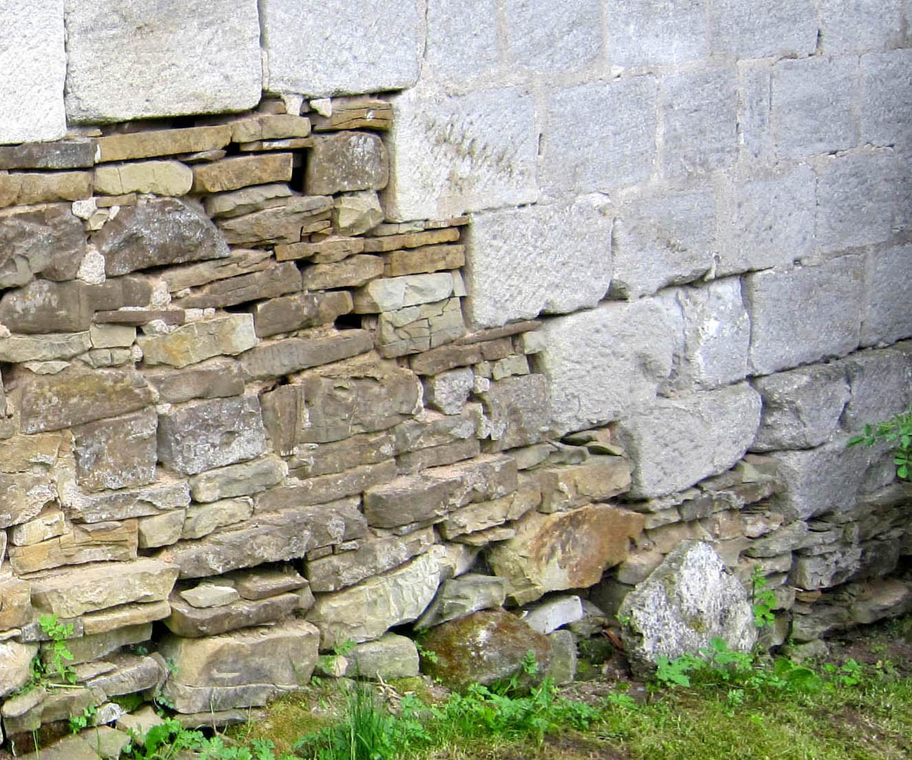 An der oberen Kirchhofmauer, aber auch neues Wagenhaus ganz von Stein. Daneben diente das Wagenhaus auch als Heulager. Später wurden das Wagenhaus mit den neu auf den Markt gekommenen Hohlblocksteinen überbaut. Ein Teil der Grundmauer aus "Angulatensandstein"- direkt auf den Grund gebaut, ist noch gut auszumachen. s.Bild oben. Die Problematik solcher Naturmauern im Zeitenlauf ist leicht zu erkennen: Schichtenabspaltungen, Hebungen, Senkungen, Eis und Frost, Regen, Hitze u.a.