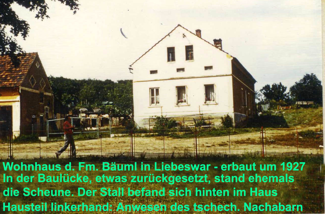 Wohnhaus der Fam. Bäuml in Liebeswar Links in der Baulücke stand früher die Scheune. Qu. aus Fam. Album v. Grg. Bäuml