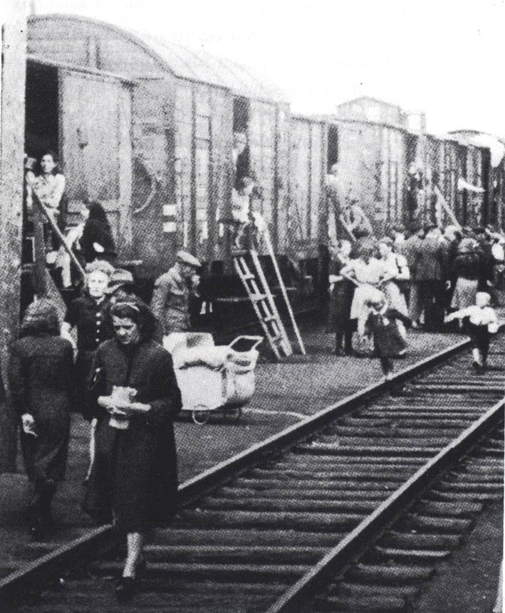 Familien kommen am 25. Oktober 1945 mit 12 Personen und ca. 68 weiteren Flüchtlingen