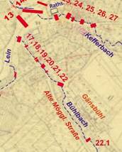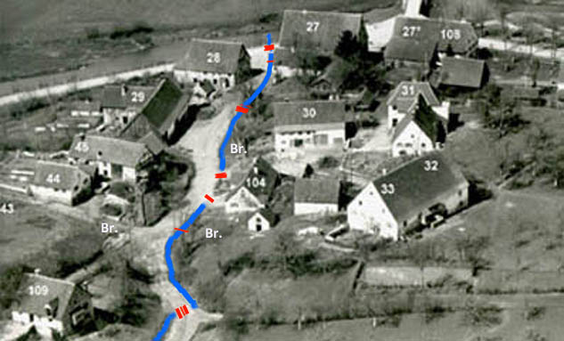 nicht selten versteckt oder sind hindurch gekrochen. Pu. 18) Geh- u. kleiner Fahrsteg zu den "Adler- Kellern" (Fahrsteg f. Schubkarren u. dgl.) Bestandszeit: bis i. d. 2. Hälfte 20. Jh. (Land-siedlungs Bebauung) Pu. 19.) 2 Gehstege zu den (Gewölbe) Kellern der Häuser Nr. 18 u. 19 (alte Hausnamen "Klopfer" u. "Koiser") Bestandzeit: *19. Jh. bis heute. (*unbest.) Pu. 20) Großer Übergang zur Auffahrt zum Bergle, der Häuser Nr. 30, 31, 32 u. 33 ( Hausnamen "Schuhmichele" - "Kindergarten u.a." - "Lauchbauer") u. z. Haus 104), heute Gemeinde- Haus. Angemerkt sei hier: bereits in d. 1. Helft. des 20. Jh. war die Auffahrt z. Bergle und weitere 15- 20 m am Haus 104 vorbei verdohlt. Pu. 21) Kleiner Behelfssteg über den Bach zum Schachtbrunnen im Garten v. Hs. 33 "Lauchbauer". Hintergrund: Johann Vatter v. Hs. 33 räumt dem Jos. Hägele u. dessen Tochter - (welche das Haus 44 li. v. Bach bewohnten) das Nutzungsrecht an dem in Prz. 173 befindlichen Pumpbrunnen ein. Auch hat Vatter einen Weg v. Hs. 44 aus über den Bach zum genannt. Brunnen herzustellen. Pu. 22) Große Bachquerung am Fuße zum hohen Gänsbühl. Hier zweigte (früher )ein Feldweg, besser eine Hohlgasse, ab zum Gänsfeld - oder z. d. Gänswiesen. Auch hier: bereits in d. 1. Hlft. des 20. Jh. war an dieser Stelle der Bach verdohlt. Pu. 22.1) (siehe Übersicht oben) Die frühen Zustände an dieser Stelle sind nicht bekannt. In der 1. Hlft. des 20. Jh. existierten kein sichtbaren Verdohlungszeichen mehr. |