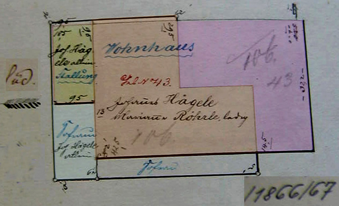 2stockigtes Wohnhaus samt Scheuer unter 1 Dach (1827 noch als eine Wohneinheit) 1873: Anteil an 1 Wohnhaus u. Hofraum - Johannes Stäb, Schneider Haus