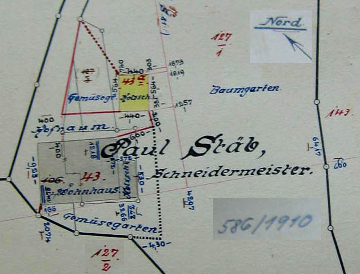 Garten und Wiese für 350 fl. Intern: Ob Stäb nun weiter das Haus 43