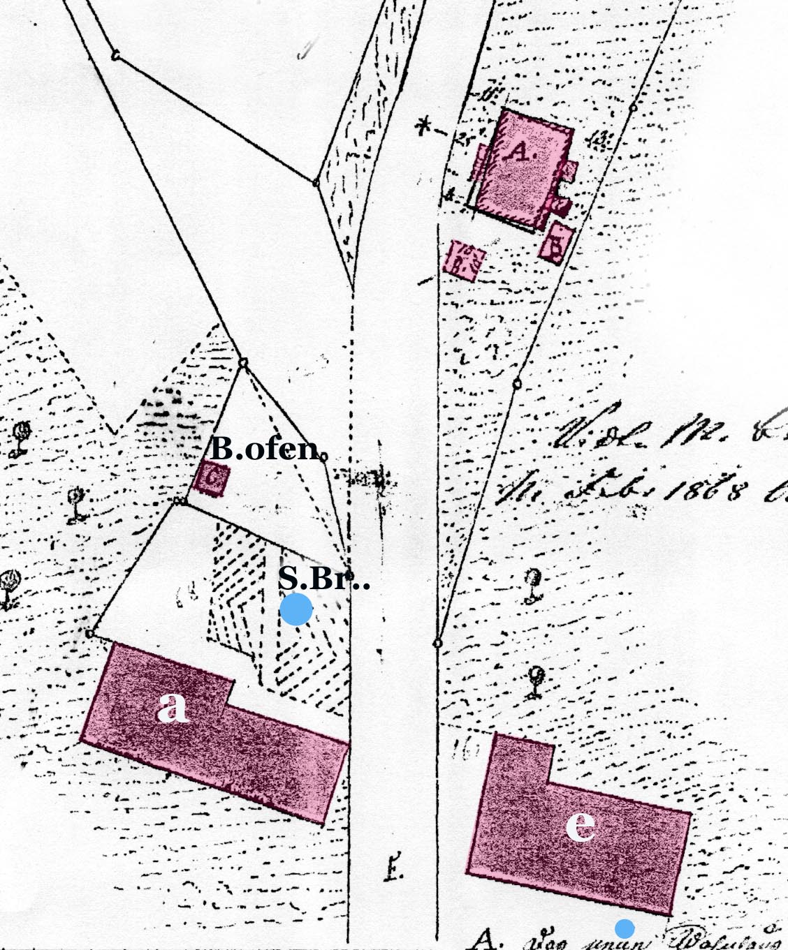 v. 1827 bis 1907 1873: Wohnhaus u. Scheuer, Hofraum, Wasch - u. Backhaus - 1 Keller 1907: Wohn - u. Ökonomiegebäude von Stein,