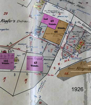 - bis zum Gb. Abbruch: Bernhard Klingenmaier, Bäcker: 2/5 an Hausteil 64. Es ist