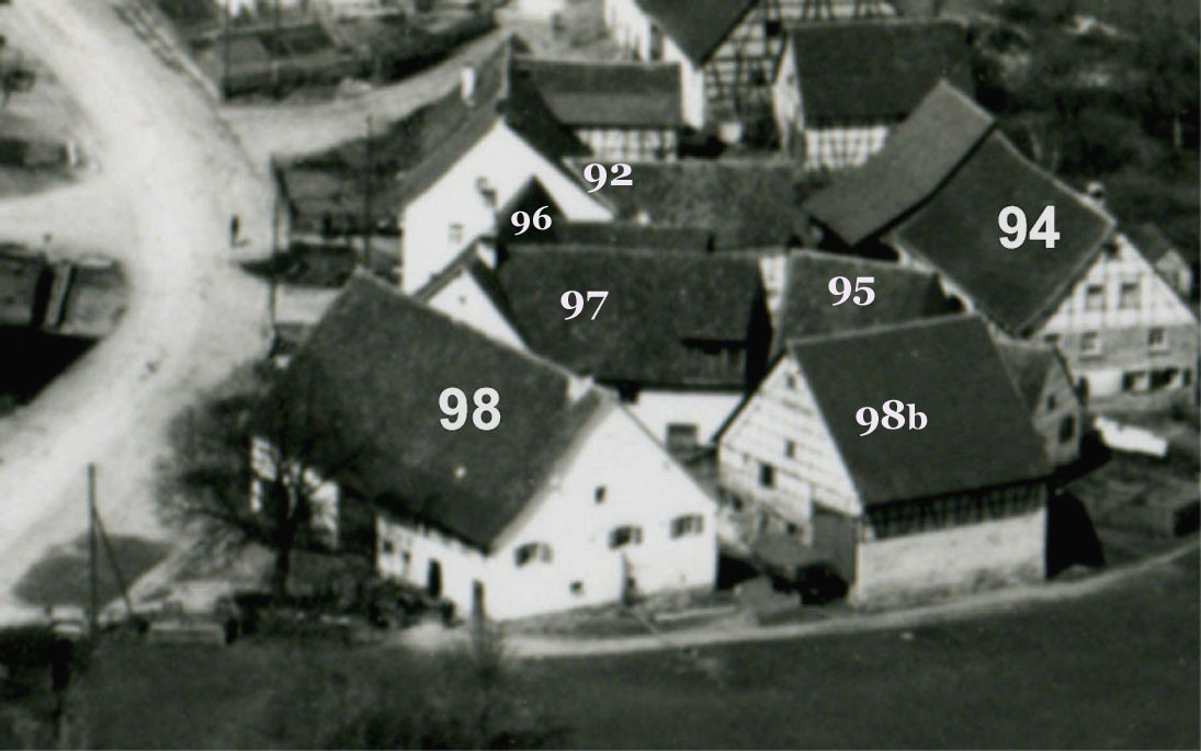 *1714. Kinder, u.a. Franz. 3. Franz Ilg, Bürger und Bauer, * 1736, + 1785, oo1775 Anna Kuhn, * 1747, +?. Intern vermerkt: Anna Kuhn ist die Schwester der Magdalena Kuhn, der Frau des Bernhard Weber - "Kolb alt" - s. Hs. 89. Aus der Ehe kommen 4 Kinder, u.a. Franz. und der Sohn Melchior, * 1775 - dieser findet sich auf Hs. 89 -siehe dort. Kerndorfensemble um 1928 .