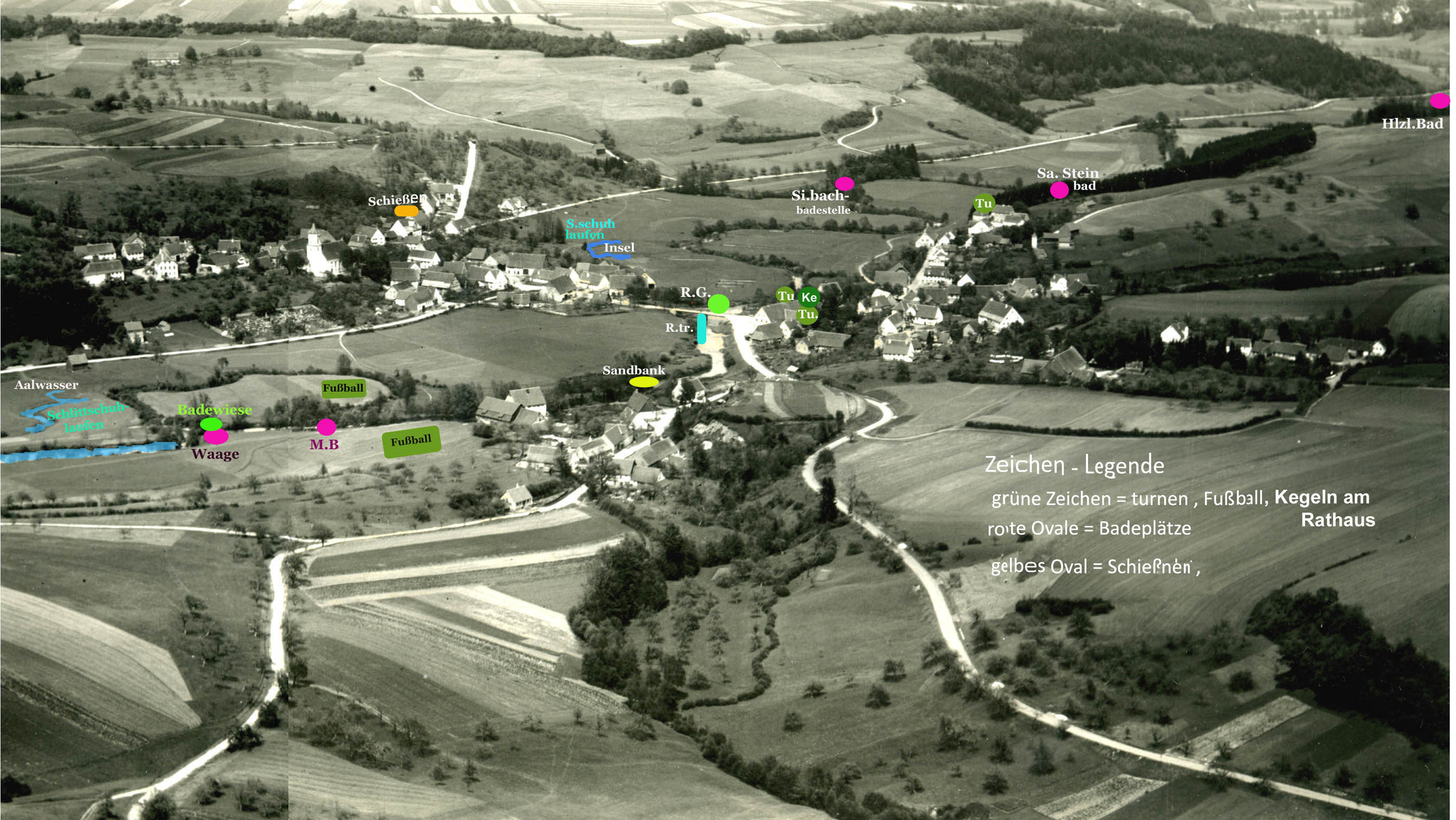 Sport in Heuchlingen entlang der Lein - ein "Sport und Badegelaende" wird erworben. Beginn und Entwicklung, Turnen, Leibesübungen, Fußball, Schwimmen, u.a.