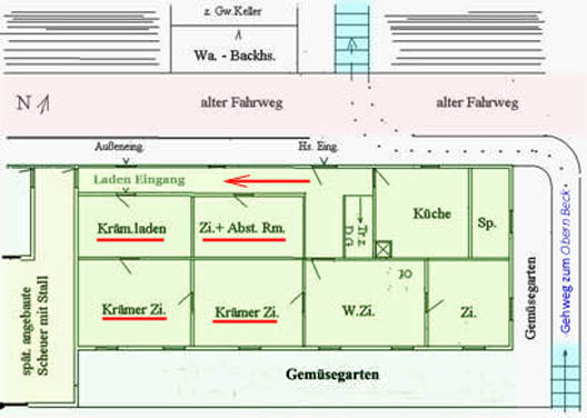 Details zu der Skizze gab uns Frau Marie Waibel, geb. 1923. Die groben Gebäudeabmessungen haben wir aus der „historischen Karte“ aus der Landesvermessung um 1840 entnommen. |