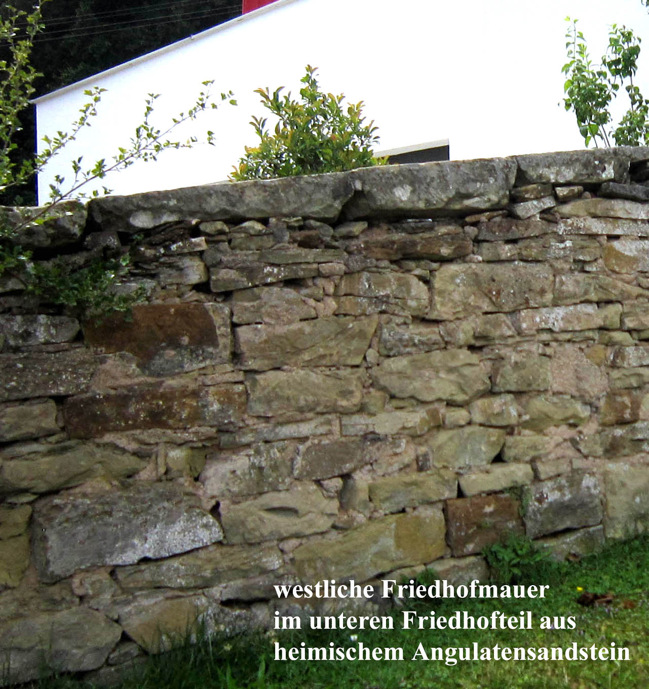 An der oberen Kirchhofmauer, aber auch neues Wagenhaus ganz von Stein. Daneben diente das Wagenhaus auch als Heulager. Später wurden das Wagenhaus mit den neu auf den Markt gekommenen Hohlblocksteinen überbaut. Ein Teil der Grundmauer aus "Angulatensandstein"- direkt auf den Grund gebaut, ist noch gut auszumachen. s.Bild oben. Die Problematik solcher Naturmauern im Zeitenlauf ist leicht zu erkennen: Schichtenabspaltungen, Hebungen, Senkungen, Eis und Frost, Regen, Hitze u.a.