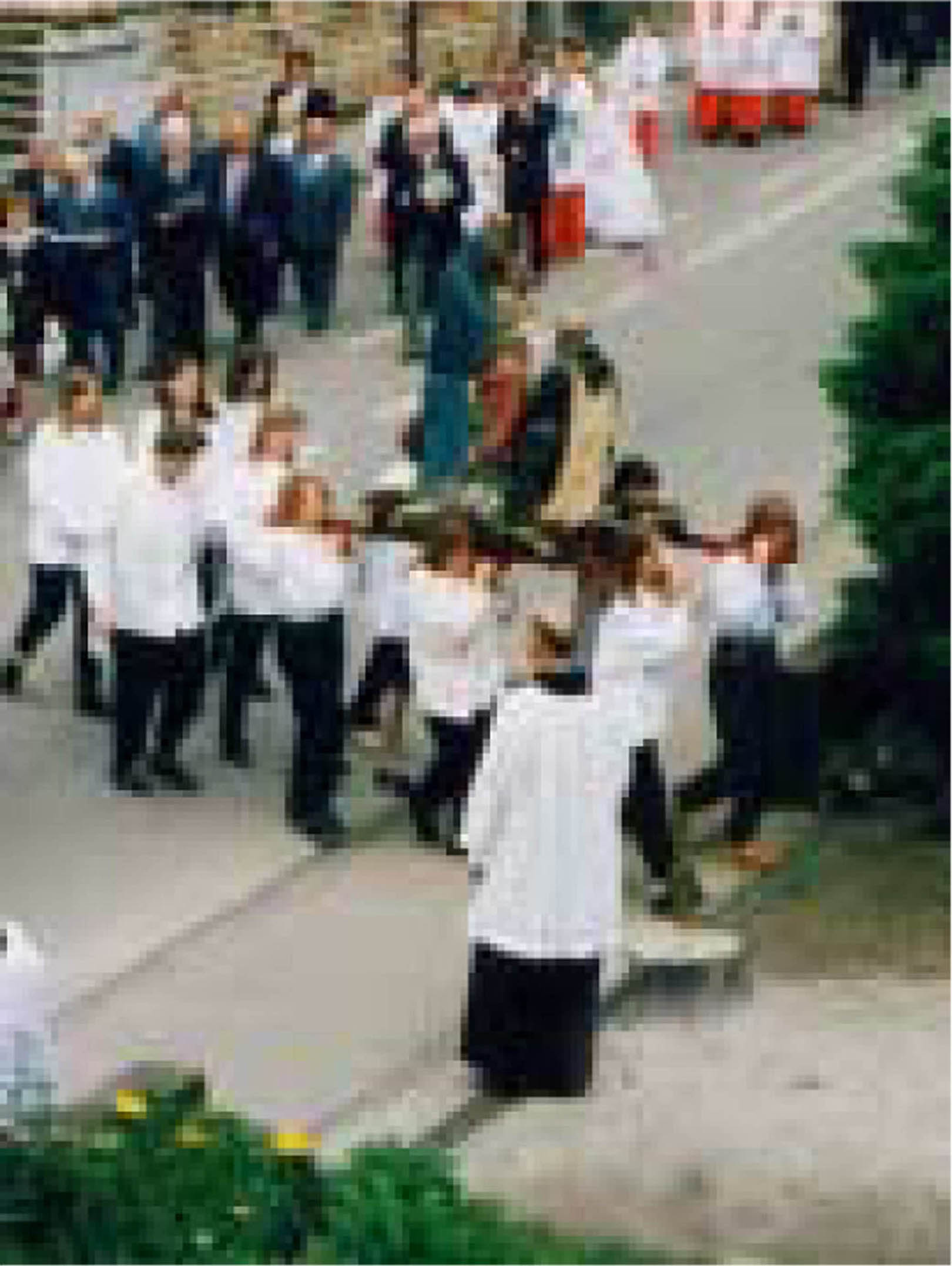 Das Bild entstand in den 1990er Jahren. Im Bild oben, vor den Ministranten, geht der Kirchenchor unter d. Leitung von Ernst Mantel.